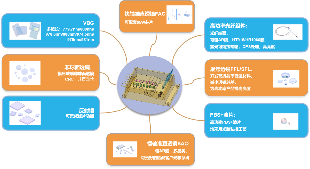公司能为客户提供光纤耦合模块使用各类精密光学元件,如FAC Lens、 高功率光纤抛光/镀膜、模压玻璃非球面透镜、VBG、高功率偏振分束器+波片、分离式PBS、SAC lens、反射镜等。